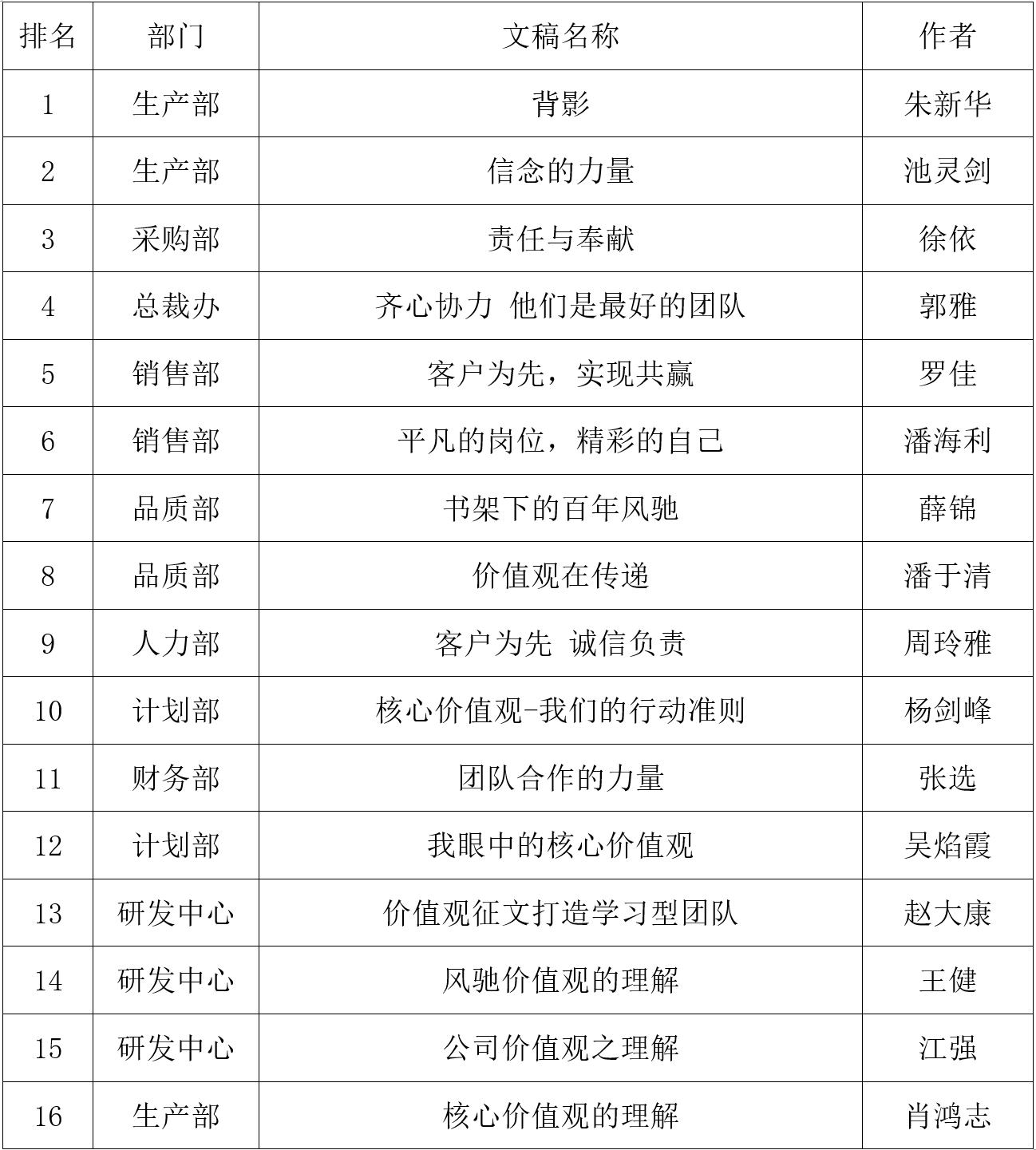 首先,評(píng)審組10位評(píng)委根據(jù)價(jià)值觀主題、文稿內(nèi)容,觀點(diǎn)表達(dá)清晰度,事實(shí)案例,語(yǔ)言表達(dá)流暢,文稿整體結(jié)構(gòu)完整性,幾個(gè)方面對(duì)稿件進(jìn)行了認(rèn)真的打分,再依據(jù)分值排名匯總至執(zhí)行總裁最終審核,得出最終評(píng)審結(jié)果:生產(chǎn)部朱新華的《背影》一文一舉奪魁,文中沒有華麗的文字,沒有網(wǎng)紅的心靈雞湯,只是簡(jiǎn)單的言語(yǔ),背后卻道出了我們公司的價(jià)值觀,平凡崗位上忙碌的背影深深印刻在每位風(fēng)馳人的心中,文章獲得評(píng)委們的一致好評(píng)。生產(chǎn)部池靈劍的《信念的力量》立場(chǎng)鮮明,主題突出,讓人感到信念的是一種熱烈的,一種噴薄而出,一種昂揚(yáng)斗志的力量,喜獲二等獎(jiǎng);采購(gòu)部徐依的《責(zé)任與豐獻(xiàn)》,總裁辦郭雅的《齊心協(xié)力,他們是最好的團(tuán)隊(duì)》并列三等獎(jiǎng)。