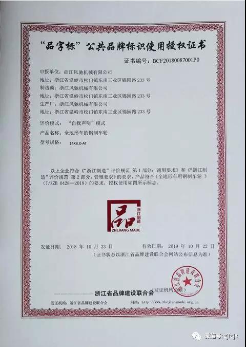 2018年10月榮獲浙江省品牌建設聯(lián)合會頒發(fā)的“品字標”公共品牌標識使用授權證書