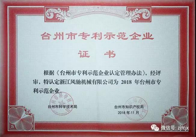 2018年11月榮獲臺州市知識產權局頒發(fā)的“臺州市專利示范企業(yè)”